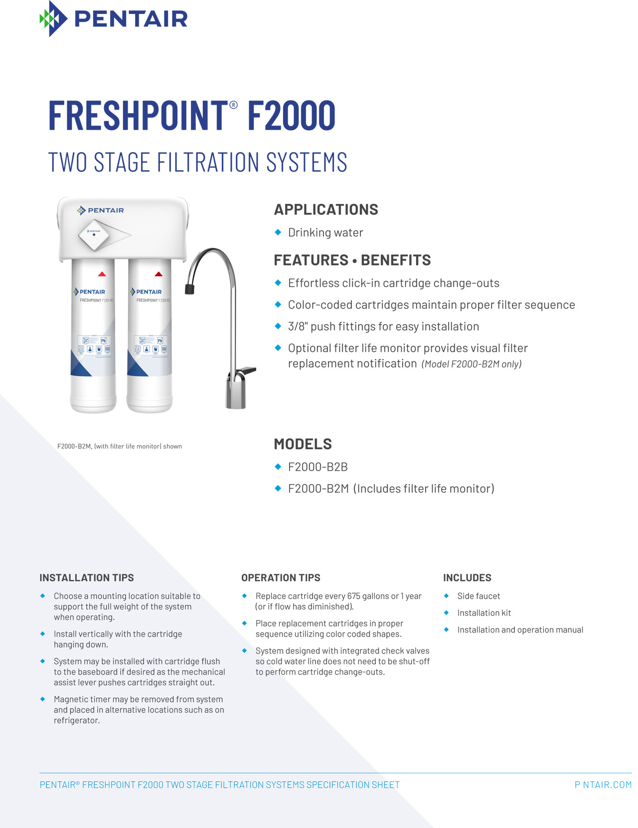 Biến nước máy thông thường thành nước uống trong lành và an toàn hơn, sảng khoái hơn bằng cách vặn vòi của bạn. Hệ thống lọc bên dưới Pentair FreshPoint F2000 có một bộ các khối carbon kép với phương tiện khử chì để giảm trầm tích và hơn 60 chất gây ô nhiễm, như clo, chì, nang * và các hợp chất hữu cơ dễ bay hơi (VOC).