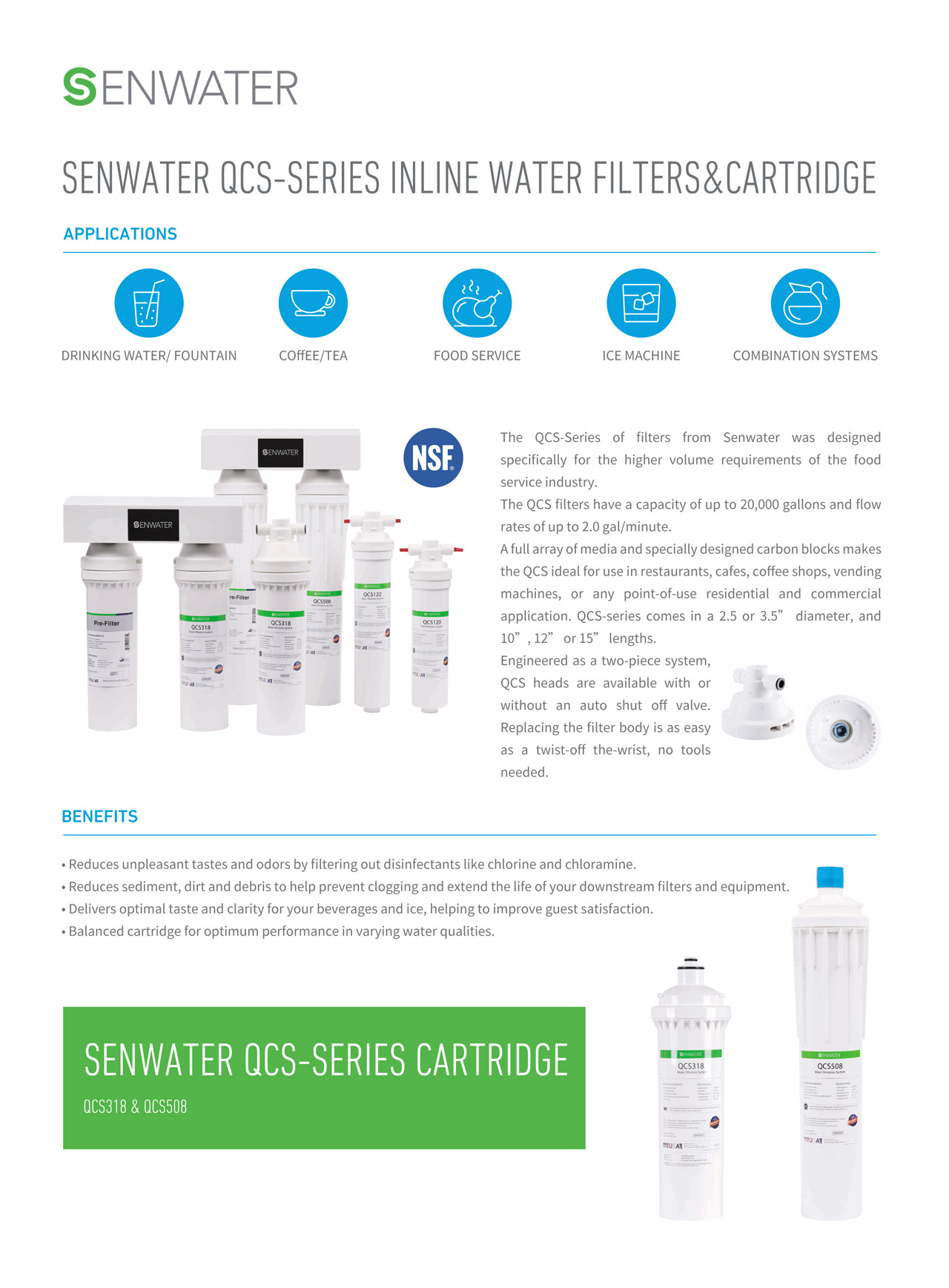 SenWater QCS318 Series đã trải qua quy trình kiểm định chất lượng nghiêm ngặt và được chứng nhận đạt tiêu chuẩn NSF/ANSI 42,52 toàn cầu, cấp bởi NSF International