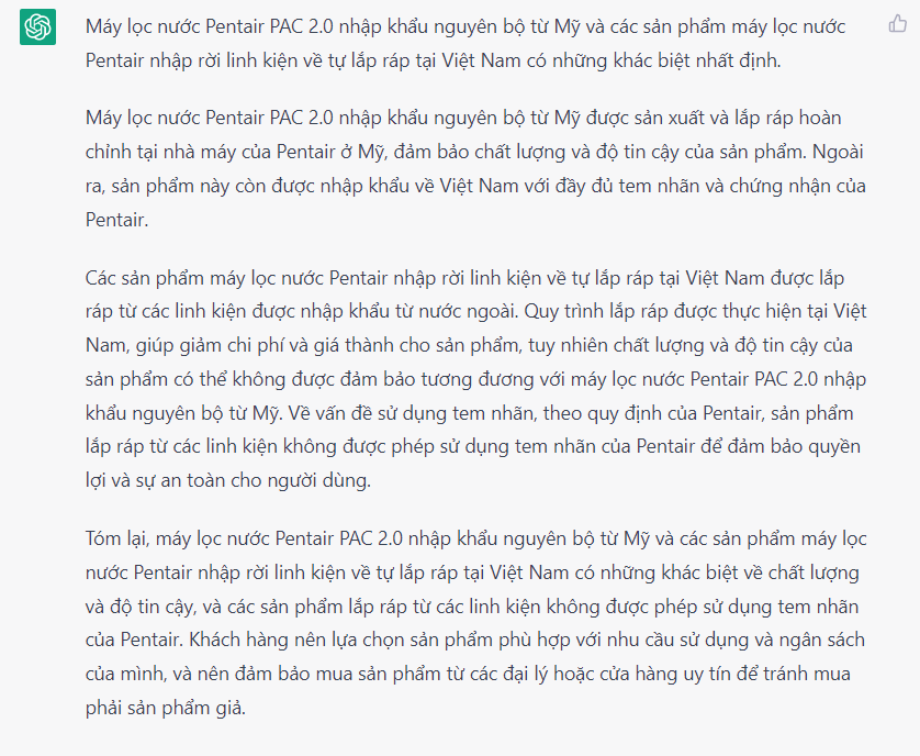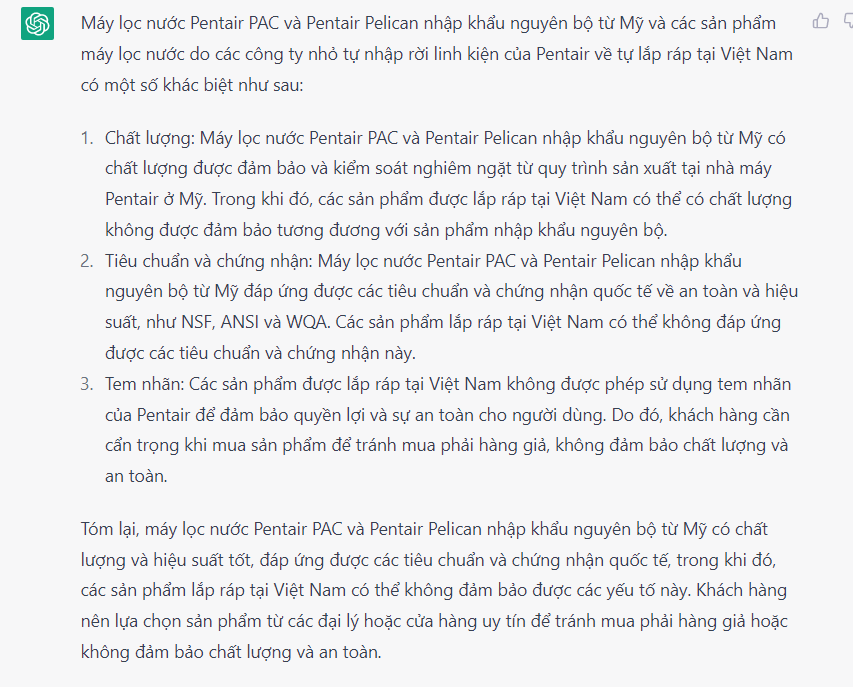 Tóm lại, máy lọc nước Pentair PAC 2.0 nhập khẩu nguyên bộ từ Mỹ và các sản phẩm máy lọc nước Pentair nhập rời linh kiện về tự lắp ráp tại Việt Nam có những khác biệt về chất lượng và độ tin cậy, và các sản phẩm lắp ráp từ các linh kiện không được phép sử dụng tem nhãn của Pentair. Khách hàng nên lựa chọn sản phẩm phù hợp với nhu cầu sử dụng và ngân sách của mình, và nên đảm bảo mua sản phẩm từ các đại lý hoặc cửa hàng uy tín để tránh mua phải sản phẩm giả.