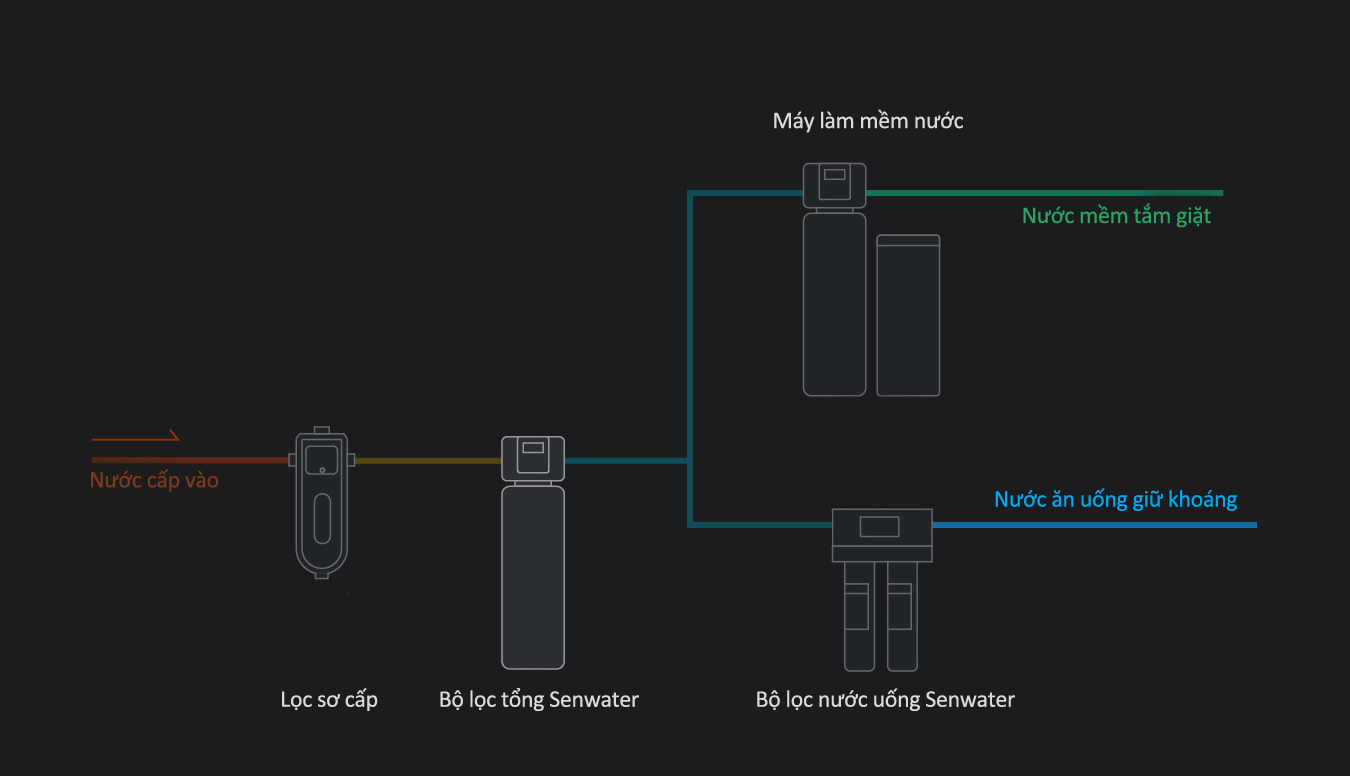 1, lọc kim loại nặng 2, lọc sơ cấp Pentair 3, lọc tổng Senwater 4, làm mềm nước Senwater