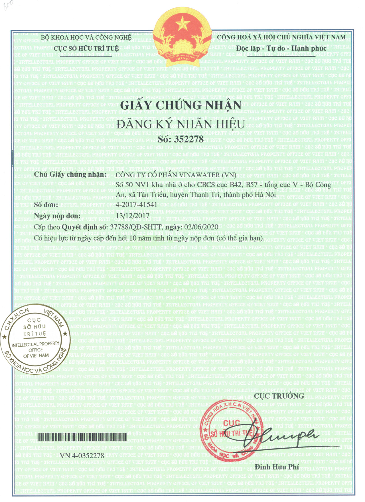 Thương hiệu VinaWater đã được bảo hộ sở hữu trí tuệ số 352278