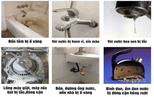 - Các thiết bị như lồng máy giặt, vỏ bình nóng lạnh, bình đun nước… có mảng bám, đóng cặn làm hoen rỉ, hư hại thiết bị nhanh hơn. - Đun nước lâu sôi, đồ ăn, thức uống có vị ngang, hay giặt quần áo cần phải cho nhiều chất tẩy rửa, bột giặt…