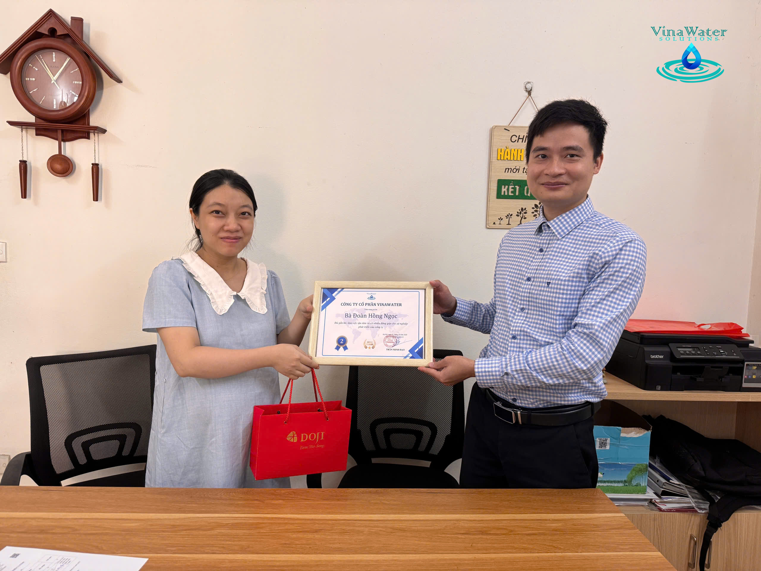 Ngày 10/10/2025, tại văn phòng Công ty Cổ phần VinaWater, Ban lãnh đạo đã tổ chức buổi trao thưởng và tri ân dành cho bà Đoàn Hồng Ngọc – nhân viên đã có nhiều năm gắn bó, tận tâm trong việc điều phối dịch vụ bảo hành, chăm sóc khách hàng và có nhiều đóng góp cho sự phát triển của công ty.